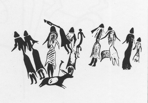 En trumma börjar, mjukt, jämt och så kommer en trumma till, också den mjuk, synkoperad med den första trumman. Så känner flickan jorden vibrera. Människorna formar dansande två svajande, vajande led. Det går så snabbt att flickan knappt uppfattar det. Plötsligt befinner sig hon och några småungar ensamma i mitten av dessa led. Tomrummet känns gigantiskt och hon känner sig pinsam. Tveksamt blir hon bara stående tills en kvinna fångar hennes blick och vinkar åt henne att komma. Brevid kvinnan, inne i ledet känns det bra igen.