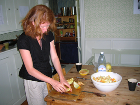 Sofie tillreder den rituella måltid vi ska äta efter svetthydderitualen.