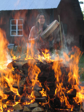 Ett annat plus gällande kursveckans arrangemang som jag från början hade betraktat som ett minus handlade om maten. Nau∂ hade tänkt anlita en lokal cateringfirma men de hade semester så vi fick dela upp oss och ansvara för maten en dag/par. Jag trodde att det skulle bli rörigt men alla la massor med känsla och kärlek i detta att bjuda och ta hand om alla andra, så det blev också en fin del av kursen. Därtill en kulinarisk resa – vi fick allt från paella till murrikastekt souvas. (För den som inte vet så är paella en spansk nationalrätt och souvas är renkött som är både rökt och rimmat. Det skärs i tunna skivor innan stekningen. Med en murrikahäll steker man över öppen eld.) Vegeterianerna ropade också matens lov, men i deras läckerheter blev jag inte så insatt, typiskt rovdjur som jag är… Apropå eld så var elden där vi värmde stenarna till svetthyddan bland de vackraste eldar jag sett – och då var jag inte ens sä rskilt positivt inställd från början – eller sugen på vare sig eld eller svetthydda eftersom vi hade haft över 30 grader varmt hela dagen.