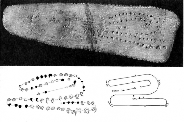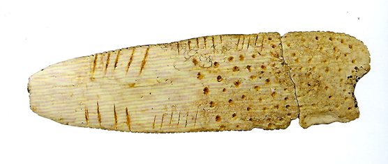 The rows of dots picked-out beneath the plaque are explanative enough of a lunar cycle during an approximate month, to be fairly convincing for the viewer (B. Cunliffe 1994:71). There is a second polished artifact similar in shape, on a bit of antler that comes from Lartet Rockshelter in France. Interestingly the second find has carefully formed rows of dots in several lines, provoking thoughts of a calendar connection. To date this ivory flake has not yet been closely analysed, to have dates definitely confirmed.