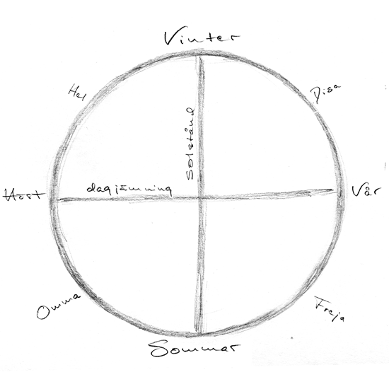 Solhjulet är årstidernas växlingar skapade av solens rörelse och eftersom det är ett hjul, en cirkel kan man börja var som helst på hjulet. Jag väljer att börja vid Helhelgen, dödens helg, eftersom död är förutsättning för liv, vilket naturligtvis innebär att liv är förutsättning för död men någonstans måste vi börja. Min upplevelse är att vi finner livet intressant och döden outgrundlig och dessutom vet vi mer om livet än om döden så Hel är för mig början på det nya året.